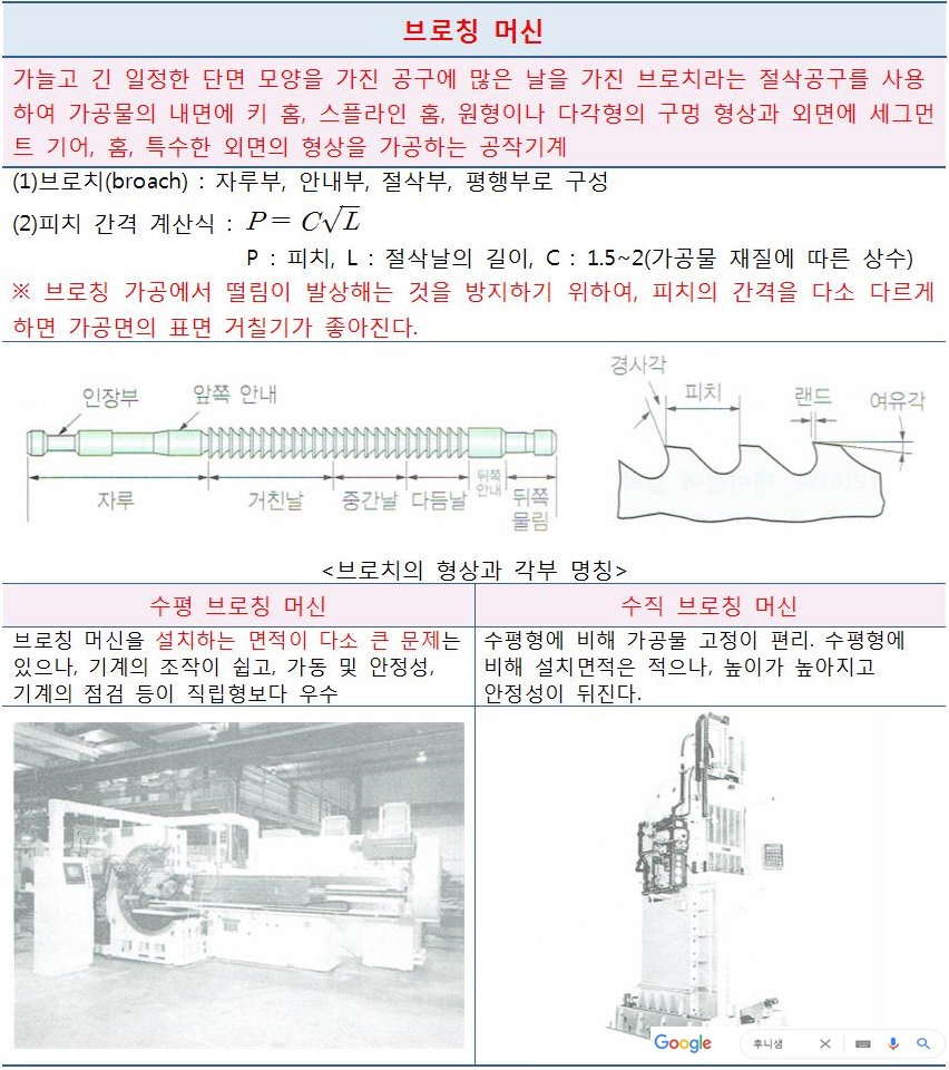 1. 브로치 절삭날 피치를 구하는 식은? (단, P = 피치, L = 절삭날의 길이, C는 가공물 재질에
