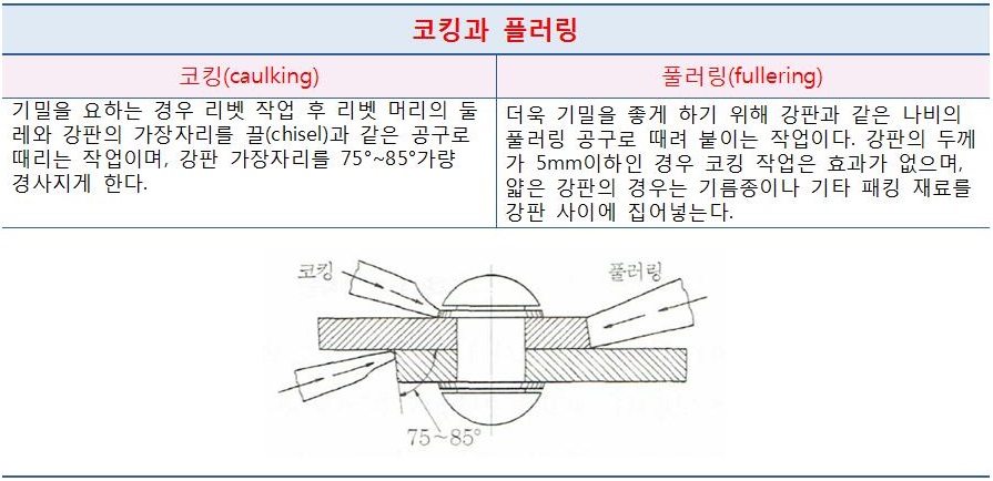 1. 정(Chisl) 등의 공구를 사용하여 리벳머리의 주위와 강판의 가장자리를 두드리는 작업을 코킹