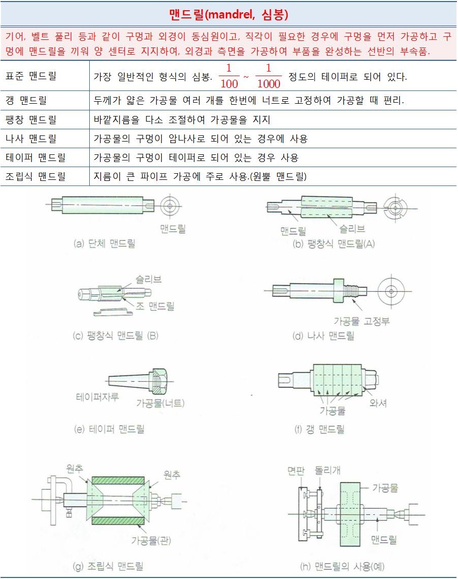 컴퓨터응용가공산업기사-맨드릴의 종류[갱 맨드릴/팽창 맨드릴/나사 맨드릴/테이버 맨드릴/원뿔 맨드릴]