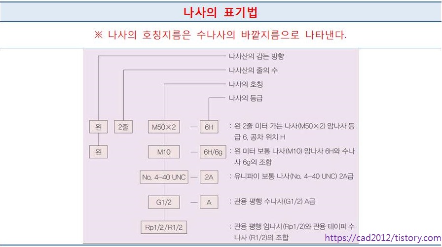 ③ 나사의 호칭이 다른 암나사와 수나사의 조합을 표시하는 경우에는 나사의 호칭을 같이 쓰고, 그 사이에 사선 '/'을 넣어서 표시한다.